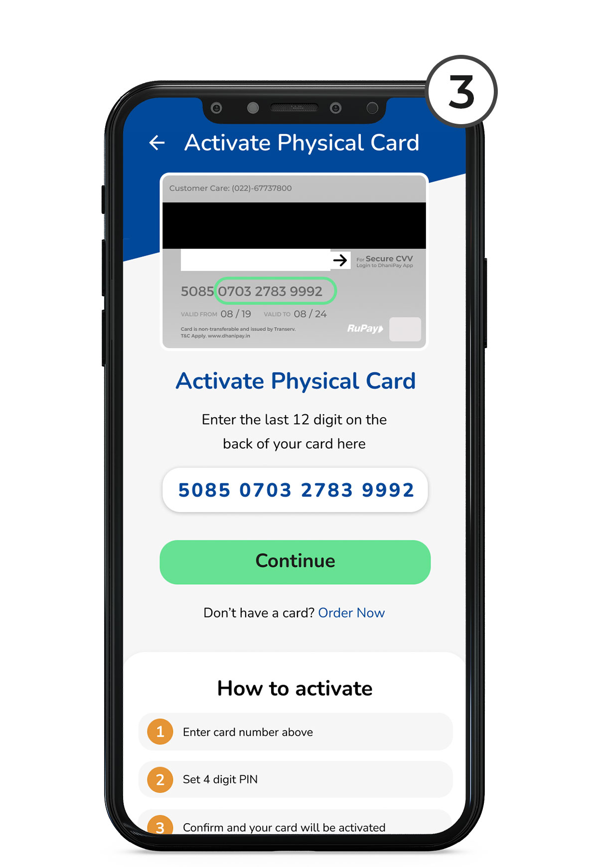 Enter 16 digit number on your physical card here & click on Continue